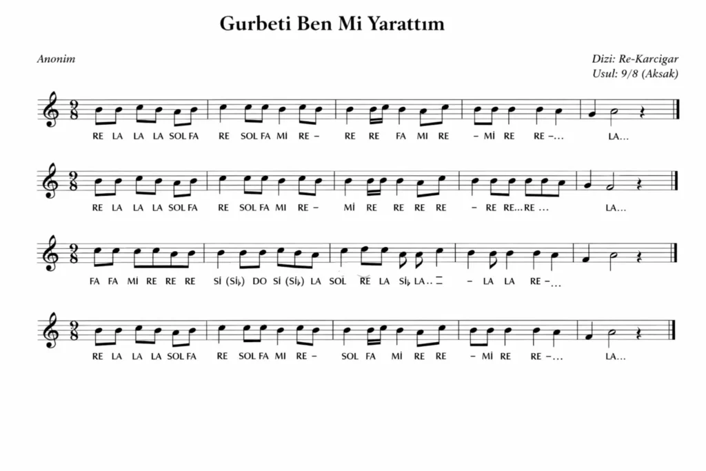 Bu nota, anonim halk türküsü olan “Gurbeti Ben Mi Yarattım” için TRT repertuvarındaki esas nota temel alınarak eğitim ve kültürel aktarım amacıyla paylaşılmıştır.